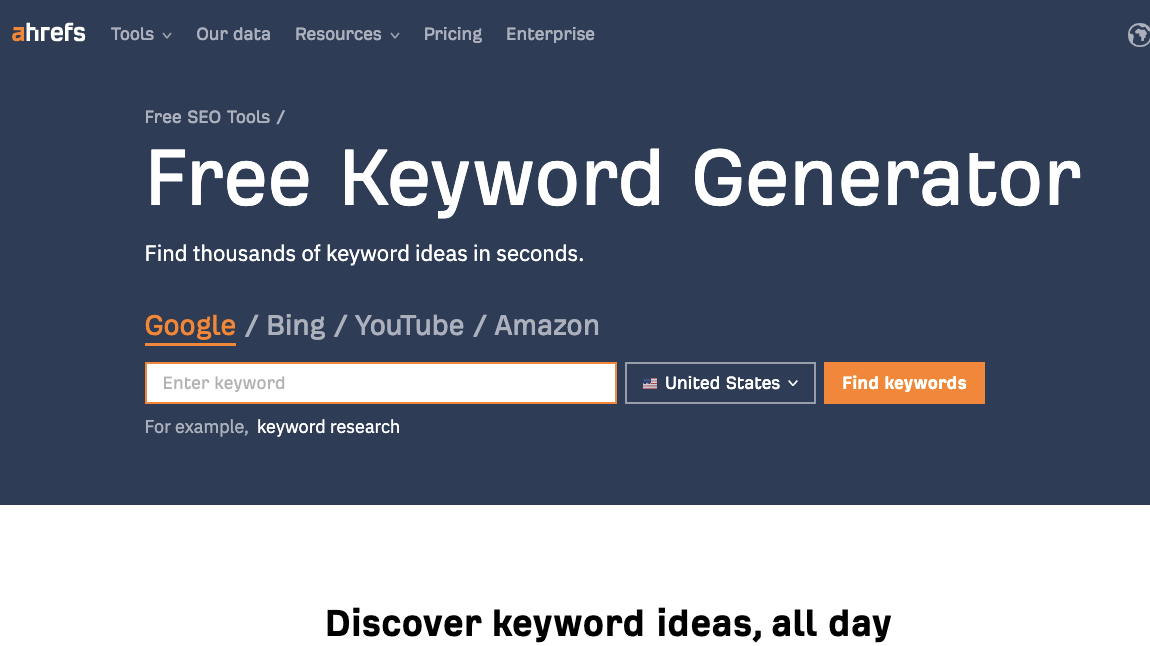 Herramientas de palabras clave gratuitas como Google Ads Keyword Planner y Ahrefs Free Keyword Generator son excelentes formas de descubrir cómo las personas buscan productos como los tuyos.